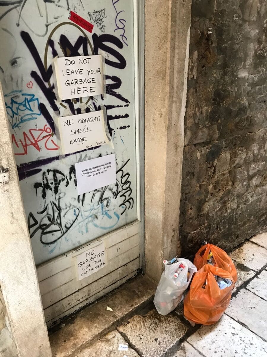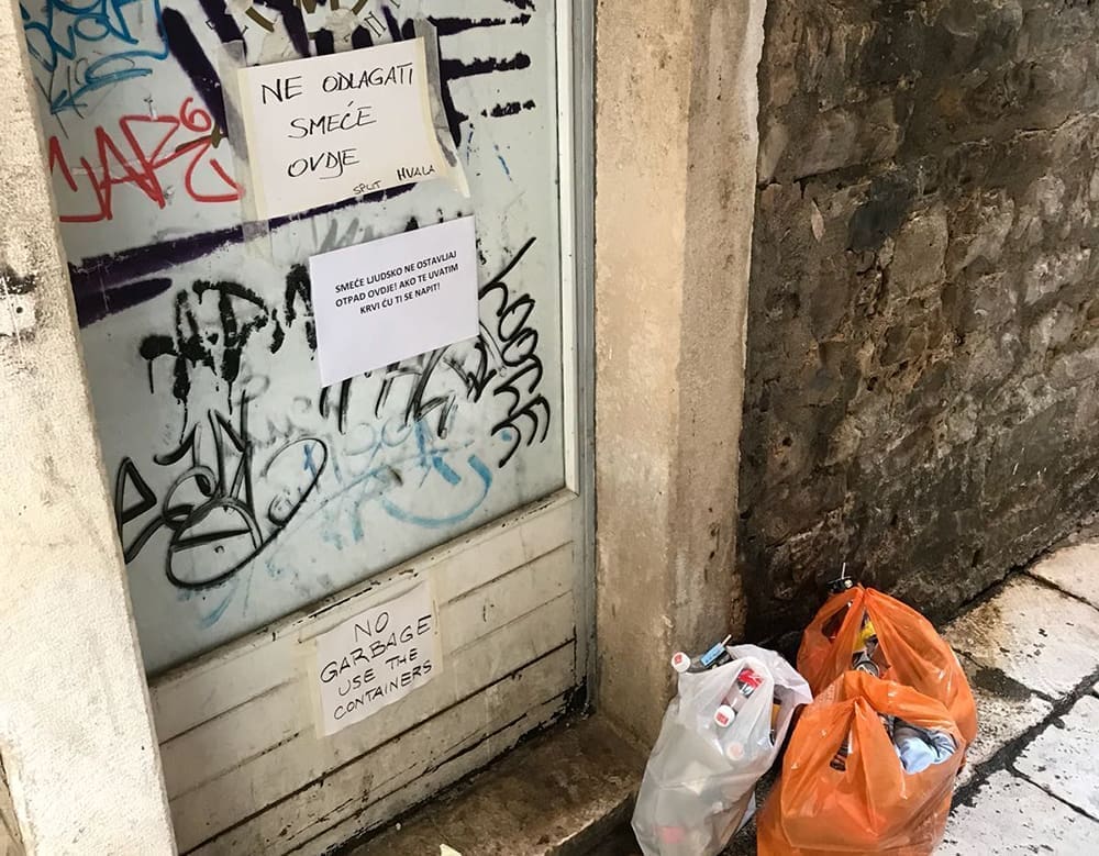 No, čini se da Splićani toliko vole bacati smeće po ulicama da ih ni ovakve prijetnje ne mogu zastrašiti. Čitatelj nam jutros šalje fotografiju kesa smeća odloženih nasred ulice. Sigurni smo da će gradske službe u prolazu smeće pokupiti, ali ovaj potez, a i potreba za ostavljanjem ovakvih poruka, govore sve o razini kulture pojedinih Splićana.