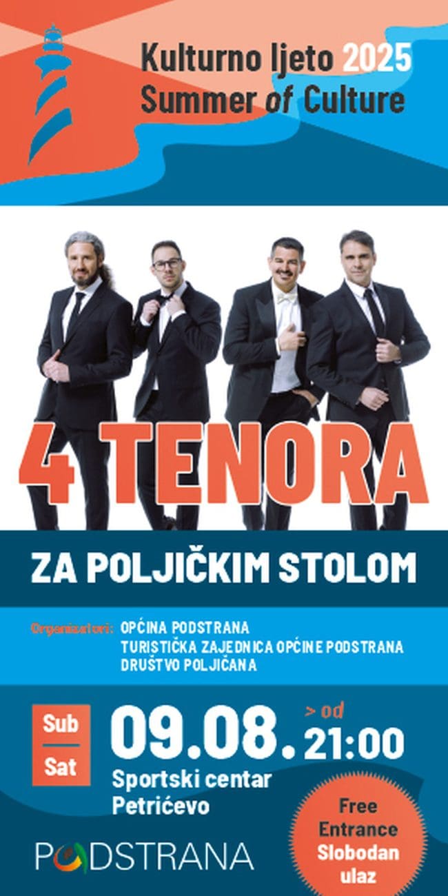 U subotu 9. kolovoza u 21:00 na sportskom centru Petrićevo na programu je redovita zabavno-gastronomska manifestacija „Za poljičkim stolom“. Za gurmanski dio pobrinut će se domaćini, a u glazbenom dijelu večeri predviđen je koncert četiri tenora.