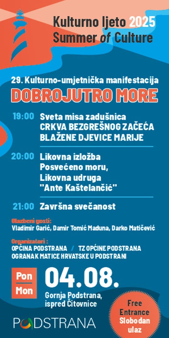 U ponedjeljak 4. kolovoza u 19:30 u Gornjoj Podstrani ispred Čitovnice održava se drugi, završni dio dvadeset devete kulturno-umjetničke manifestacije „Dobrojutro more“ koju će popratiti prigodna izložba radova članova Likovne udruge „Ante Kaštelančić“. U glazbenom dijelu programa nastupaju klapa Praska i Vladimir Garić. Podstrani ne manjka ljubavi prema biranom pjesničkom i glazbenom izričaju. Dođite i potvrdite to svojom prisutnošću. Čekamo vas!