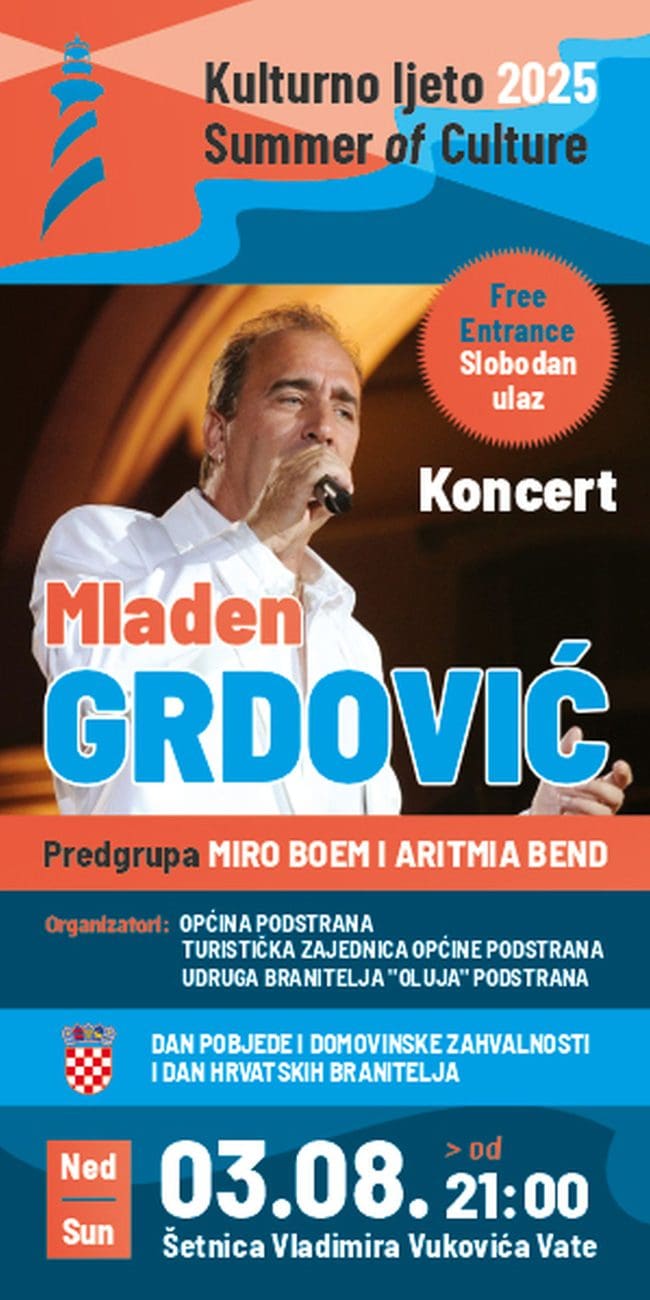 Iste večeri, ali sat poslije, u nedjelju 3. kolovoza u 21:00 na Šetnici hrvatskog branitelja Vladimira Vukovića Vate Podstrana upriličuje proslavu Dana pobjede i domovinske zahvalnosti i dan hrvatskih branitelja uz prigodan koncert Mladena Grdovića i predgrupe Mira Boema i Aritmia Benda. Bit će spektakularno!