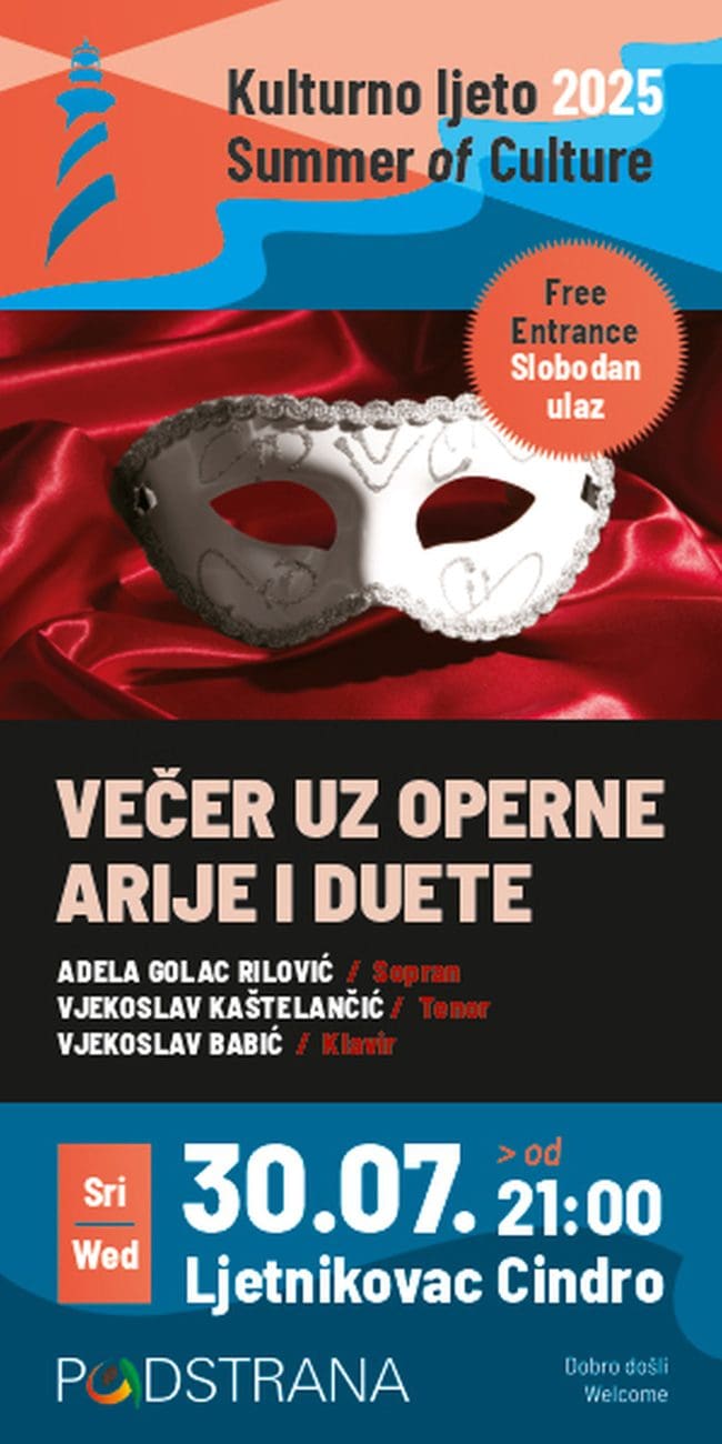 U srijedu 30. srpnja u 21:00 u perivoju ljetnikovca Cindro organizira se već tradicionalna večer uz operne arije i duete. Nastupaju sopranistica Adela Golac Rilović i tenor Vjekoslav Kaštelančić. Pjevanje će sviranjem na klaviru popratiti Vjekoslav Babić. Nemojte propustiti prigodu da čujete vrhunske operne melodije u izvedbi naših izvrsnih interpretatora pjevača i klavijaturista.