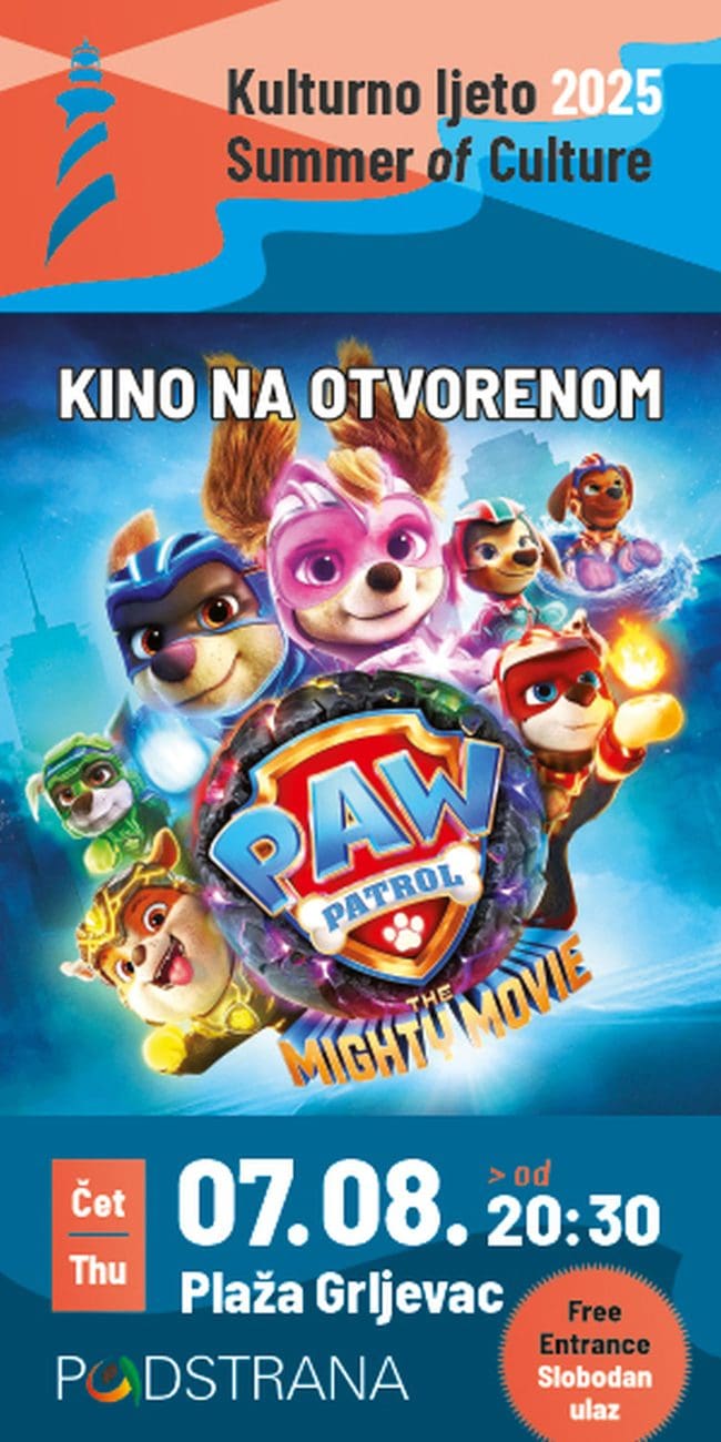 U četvrtak 7. kolovoza u 20:30 na plaži u Grljevcu uživat ćete u kinu na otvorenom uz projekciju animiranog filma „Paw patrol“.Opustite se u divnom grljevačkom ambijentu uz simpatične animirane likove.
