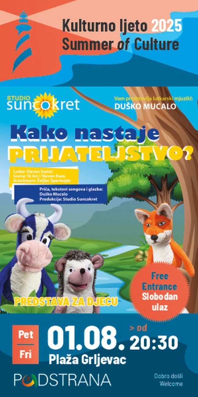 U petak 1. kolovoza u 20:30 na plaži Grljevac studio „Suncokret“ izvest će predstavu za djecu po naslovom „Kako nastaje prijateljstvo“. Ova će divna priča ispričana riječima i pokretom zasigurno razgaliti naše najmlađe toga ih povedite i uživajte skupa s njima!