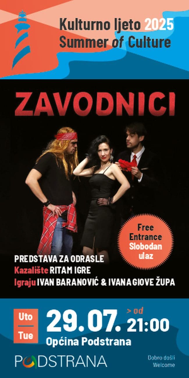 U utorak 29. srpnja u 21:00 ispred zgrade Općina Podstrana održat će se predstava za odrasle pod naslovom „Zavodnici“ u aranžmanu i izvedbi kazališta „Ritam igre“.