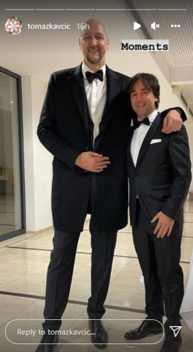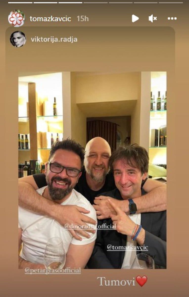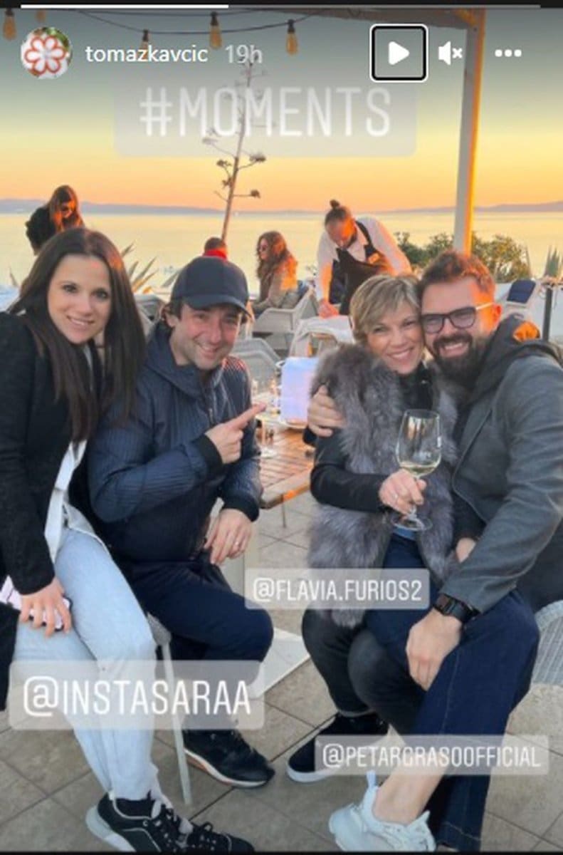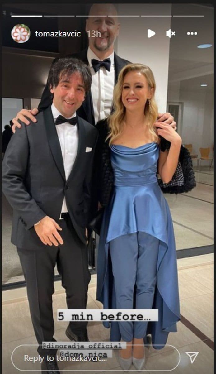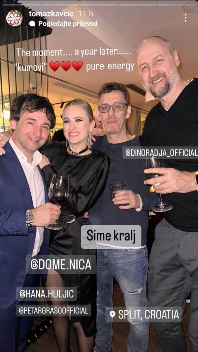 Tomaž je na proslavu stigao sa suprugom Flavijom, a oglasio se i u svojim pričama na Instagramu, gdje je objavio fotografiju na kojoj pozira s preostala dva Petrova vjenčana kuma, njegovim prijateljem iz djetinjstva Šimom Podujom i bivšim košarkašem Dinom Rađom, te s pjevačicom Domenicom Žuvelom, koja je bila vjenčana kuma Hani. Fotografiju pogledajte u našoj galeriji.