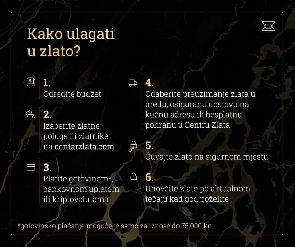 Zamjena kuna za zlato moguća je u nekoj od poslovnica Centra Zlata, a moguća je i kupnja zlata na daljinu preko webshopa uz 100% osiguranu dostavu na kućnu adresu u roku tri radna dana. Centar Zlata svim klijentima nudi i opciju besplatne pohrane poluga i zlatnika prvih godinu dana, ali kupac može svoje zlato preuzeti odmah i sam ga pohraniti, ako to želi.