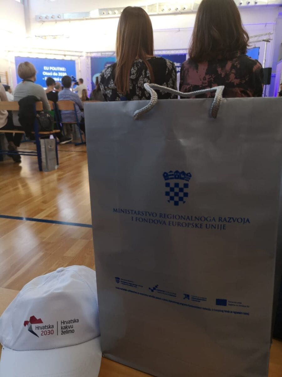 Posjetitelji konzultacija na poklon su dobili poklon vrećicu s nekoliko artikala Ministarstva regionalnog razvoja i fondova Europske Unije. Vrećice su sadržavale kapu, bombone, blok za pisanje i kabanicu od tanke plastike. Lijepu gestu na događaju vezanom uz budućnost hrvatskih otoka zasjenila je činjenica da poklonjeni proizvodi mahom - nisu hrvatski! Iako sadrži hrvatske napise, kapa je proizvedena u Kini. Bomboni ne sadrže bilo kakvu deklaraciju, a poklonjena kabanica je od pvc materijala koji je netom zabranjen u nekim EU zemljama.