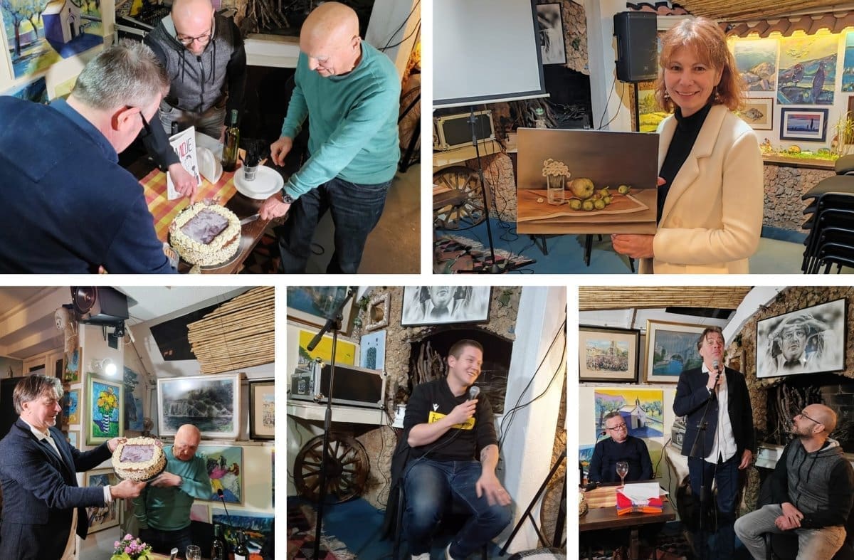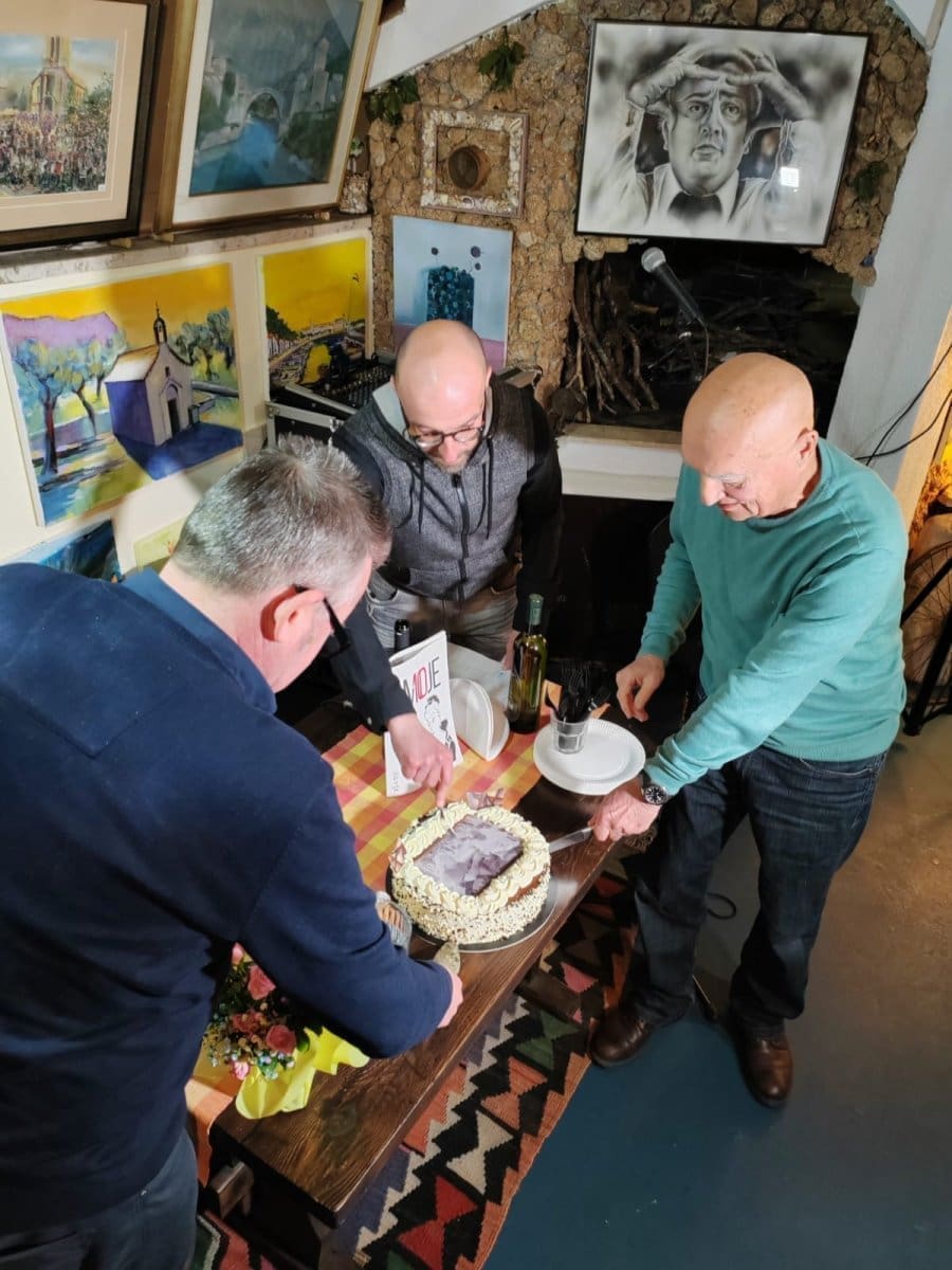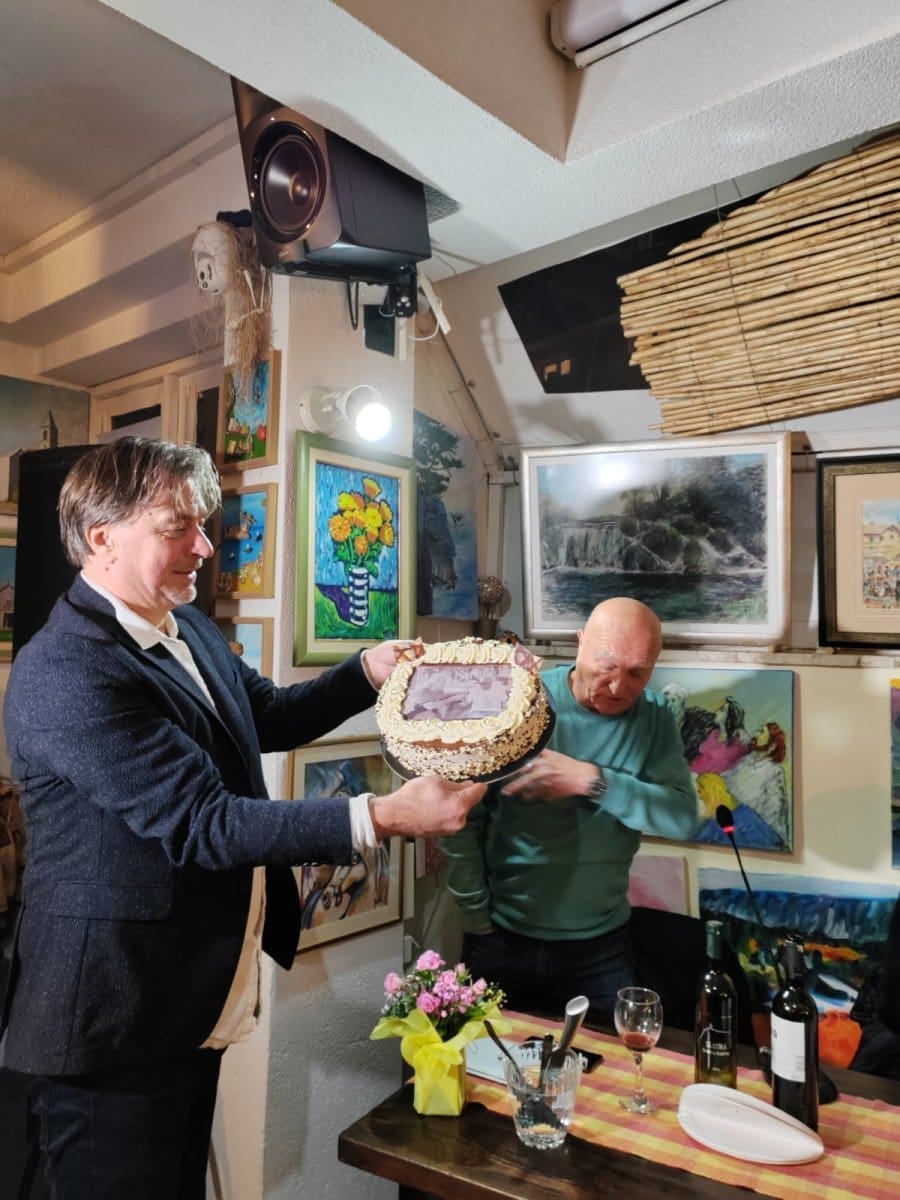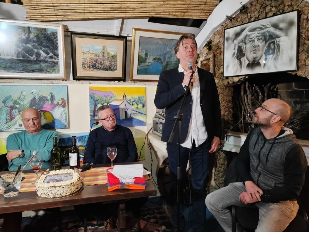 Da bismo mogli o onome što “Kus Njega” predstavlja danas, vratiti nam se tih 16 godina unatrag. Sjedio je već spomenuti Maduna s nekoliko istomišljenika, koji se nikako nisu mogli miriti s onom da je ljeti gužva i vruće, a zimi pustoš i studen, pa su za stolom dali riječ, kako će napraviti udrugu, koja se svaku zimu misto, koje se prvi put u Kreševskoj povelji spominje, zimi učiniti, barem petkom živim i toplijim. I zbilja, od tada, zimi se Maduni poklisari. A ne bi se poklisarilo da priča nije dobra i da Maduna nije totalno vanka škvare. Sada je već postao standard, a poklisari ostanu razočarani, ako im njihov galerista ne dovede u konobu kakvu krupnu ribu. Tako je sinoć u konobi obilježena stota Smojina obljetnica, a gosti su bili Klarić, Ivanišević, Šarac, te nimalo nebitno, jedna Tonka što je u amanet hrvatske zabavne glazbe ušla tako što ne znade reći cvrčak. Evociralo se more uspomena, izdvojit ćemo samo kap, a to je da je Smoje upravo u Tučepi počeo pisati Malo Misto.