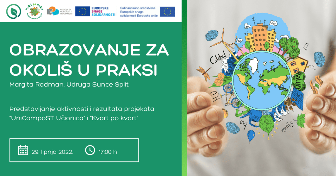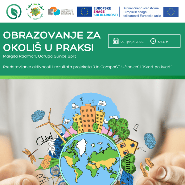 U sklopu projekata "UniCompoST Učionica" i "Kvart po kvart" financiranih sredstvima iz programa Europskih snaga solidarnosti, 29. lipnja 2022. s početkom u 17:00h održat će se webinar na temu "Obrazovanje za okoliš u praksi".