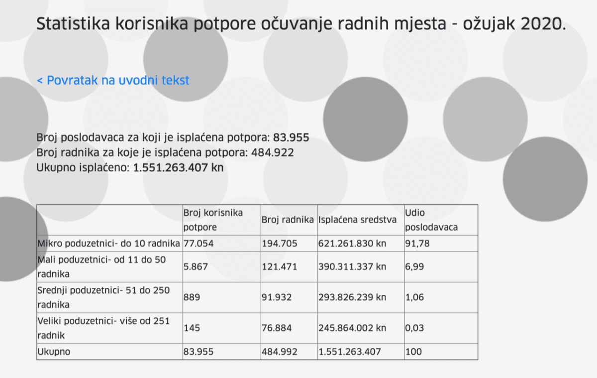 Prema izvješću s HZZ-au ožujku je isplaćeno više od 1,5 milijardi kuna za 484.992 radnika u vidu potpore za očuvanje radnih mjesta. Može se očekivati i porast potpora za travanj. Iz izvješća za ožujak, poslodavci s više od 100 zaposlenika zapošljavajuukupno nešto više od 130 tisuća radnika. Ukoliko konzervativno procijenimo da bi samo 30% poslodavaca moglo zadržati 750 kn po radniku u travnju, tada bi porezni obveznici bili oštećeni za nešto manje od 30 milijuna kuna. Kada se 30%-tna konzervativna procjena primjeni na sveposlodavce, osim onih koji zapošljavaju jednog zaposlenika, govorimo o nešto više od 450 tisuća radnika. Tada se štete broje u više od 100 milijuna kuna.