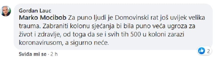 "Za puno ljudi je Domovinski rat još uvijek velika trauma. Zabraniti kolonu sjećanja bi bila puno veća ugroza za život i zdravlje, od toga da se i svih tih 500 u koloni zarazi koronavirusom, a sigurno neće" - prenosi Index.