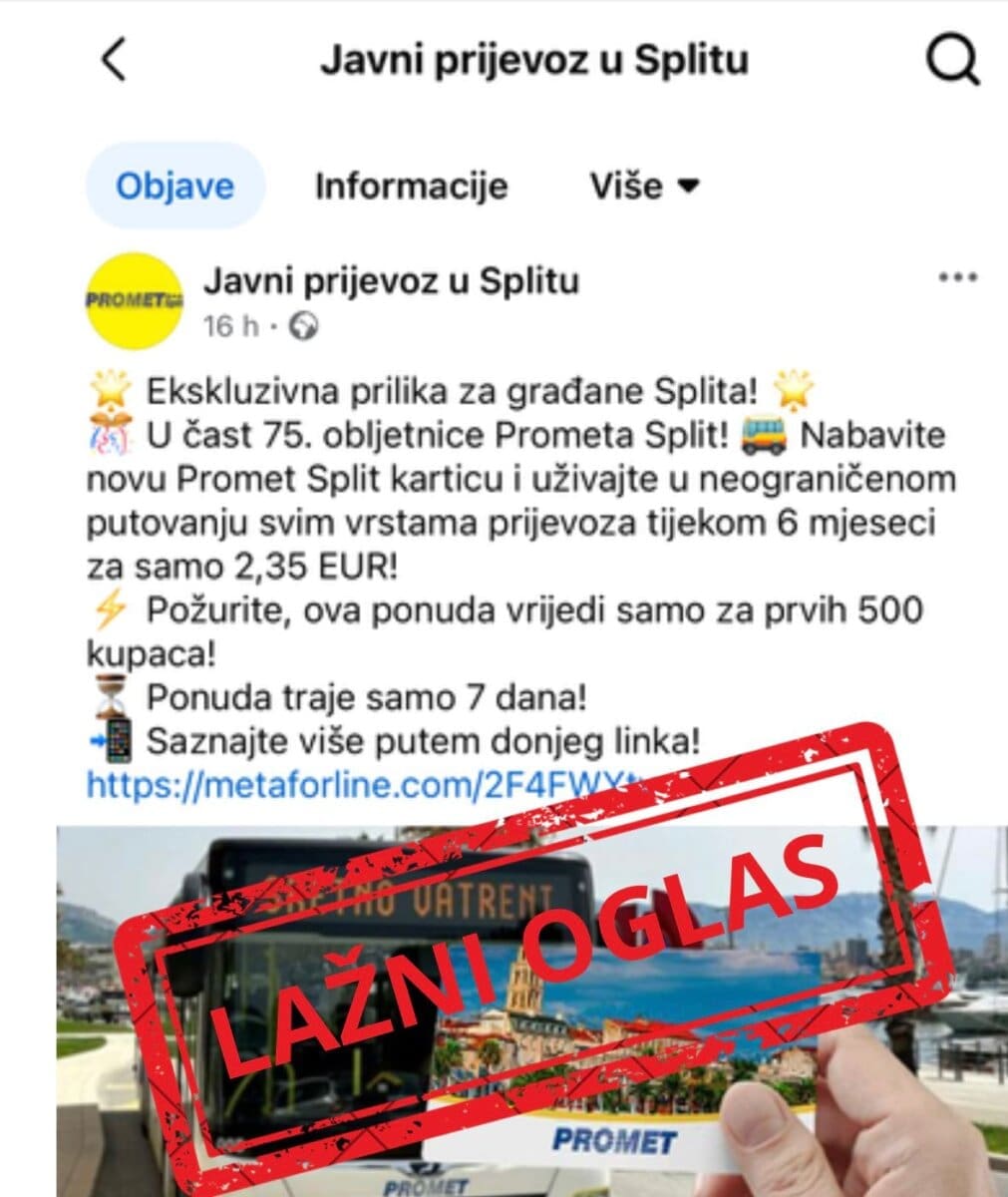 Promet Split upozorava građane na ponovnu pojavu lažnih oglasa na društvenim mrežama.