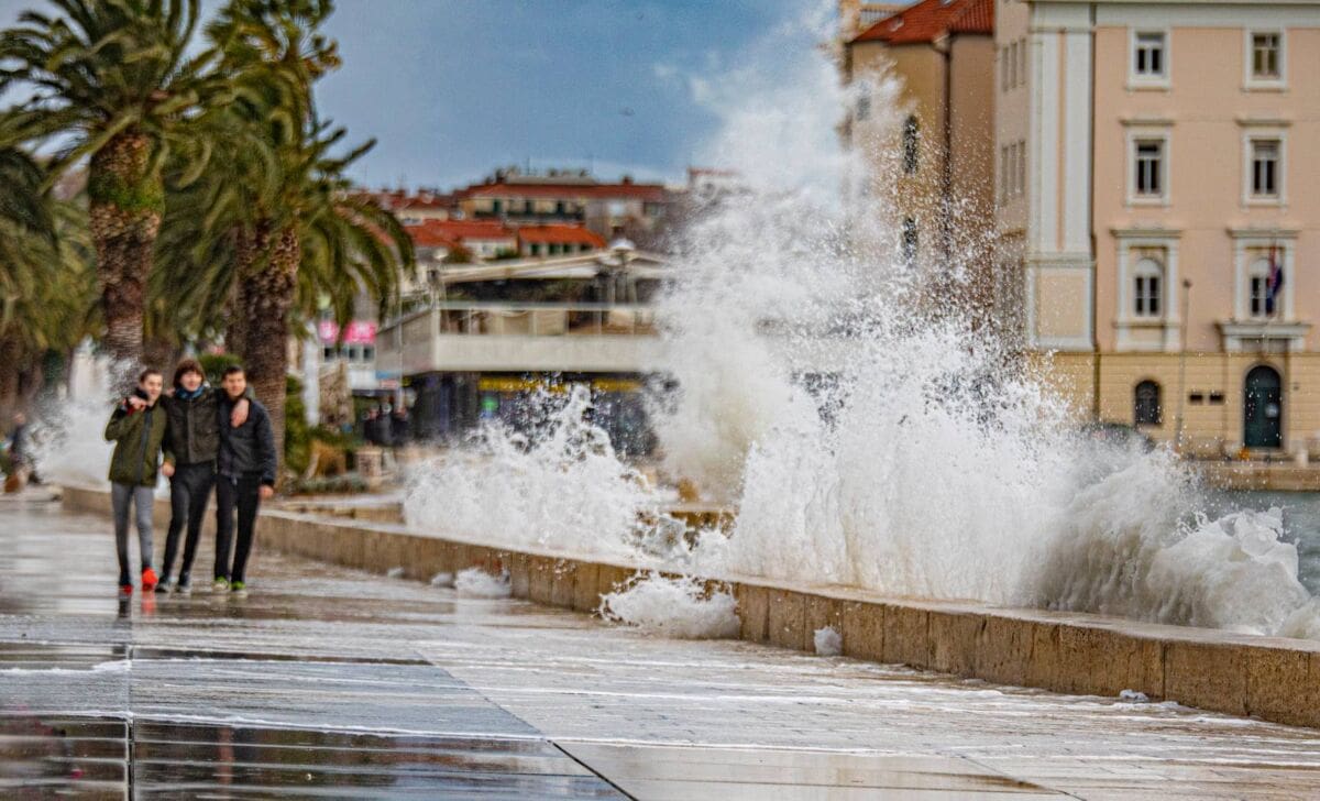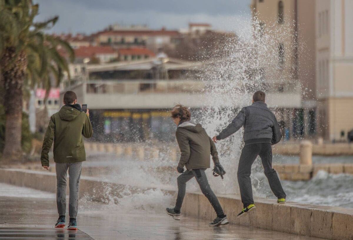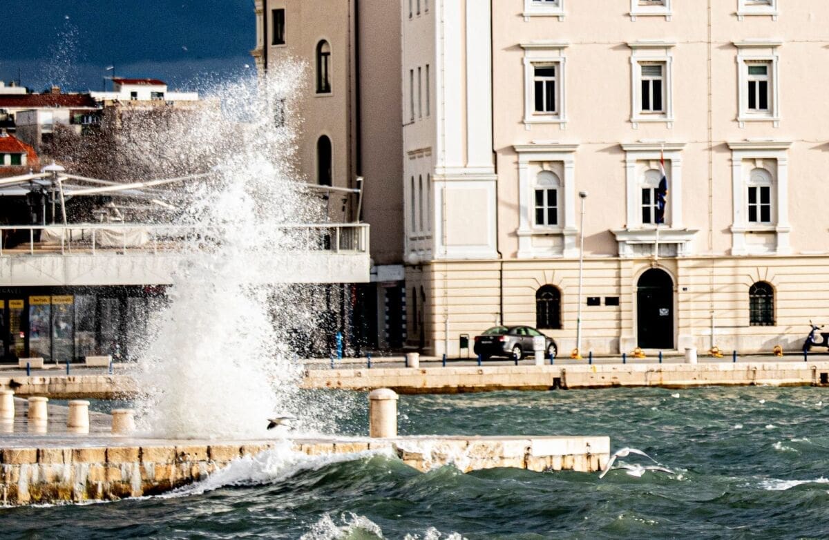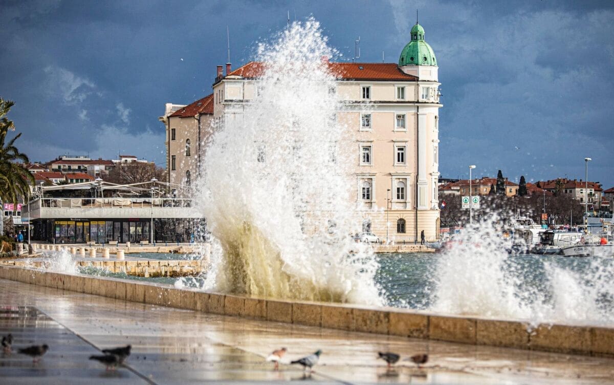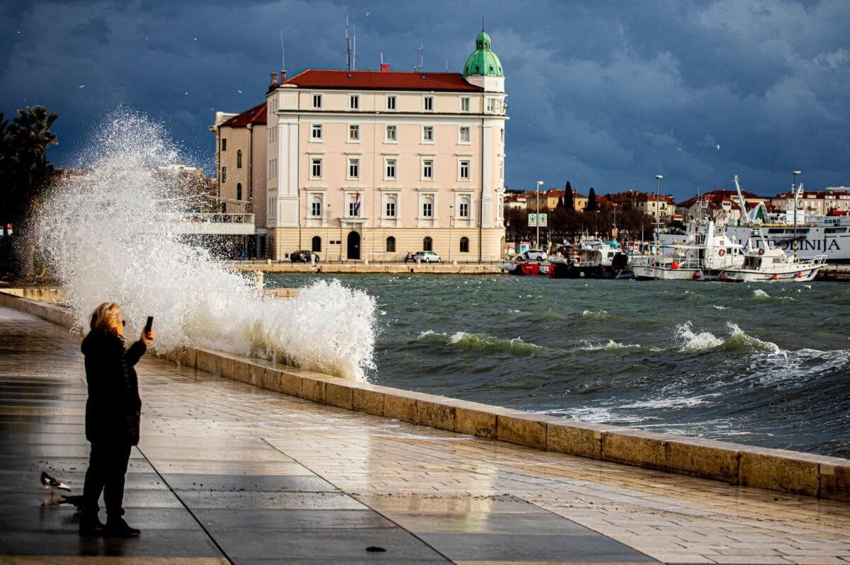 Subota je pravi dan za šetnju po splitskoj Rivi, no danas je valjalo izbjegavati dijelove bliže moru. Naime, jak lebić puše cijeli dan, a najjače udare imao je jutros (109 km/h) pa su valovi "divljali".