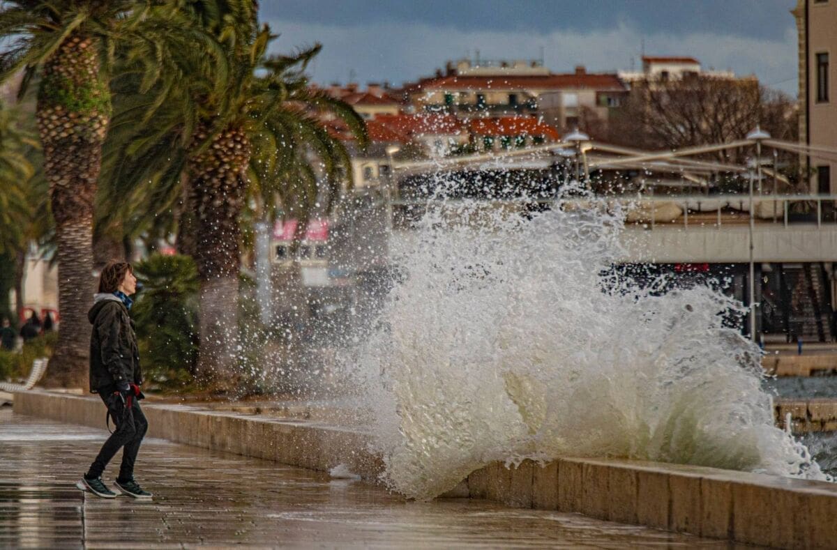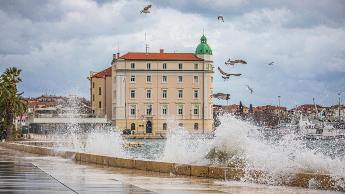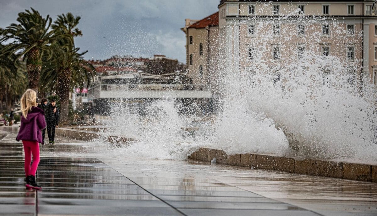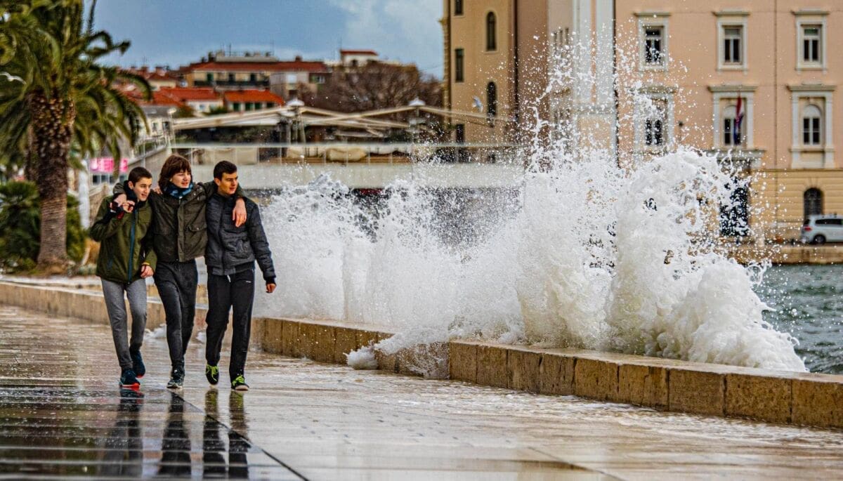 Subota je pravi dan za šetnju po splitskoj Rivi, no danas je valjalo izbjegavati dijelove bliže moru. Naime, jak lebić puše cijeli dan, a najjače udare imao je jutros (109 km/h) pa su valovi "divljali".