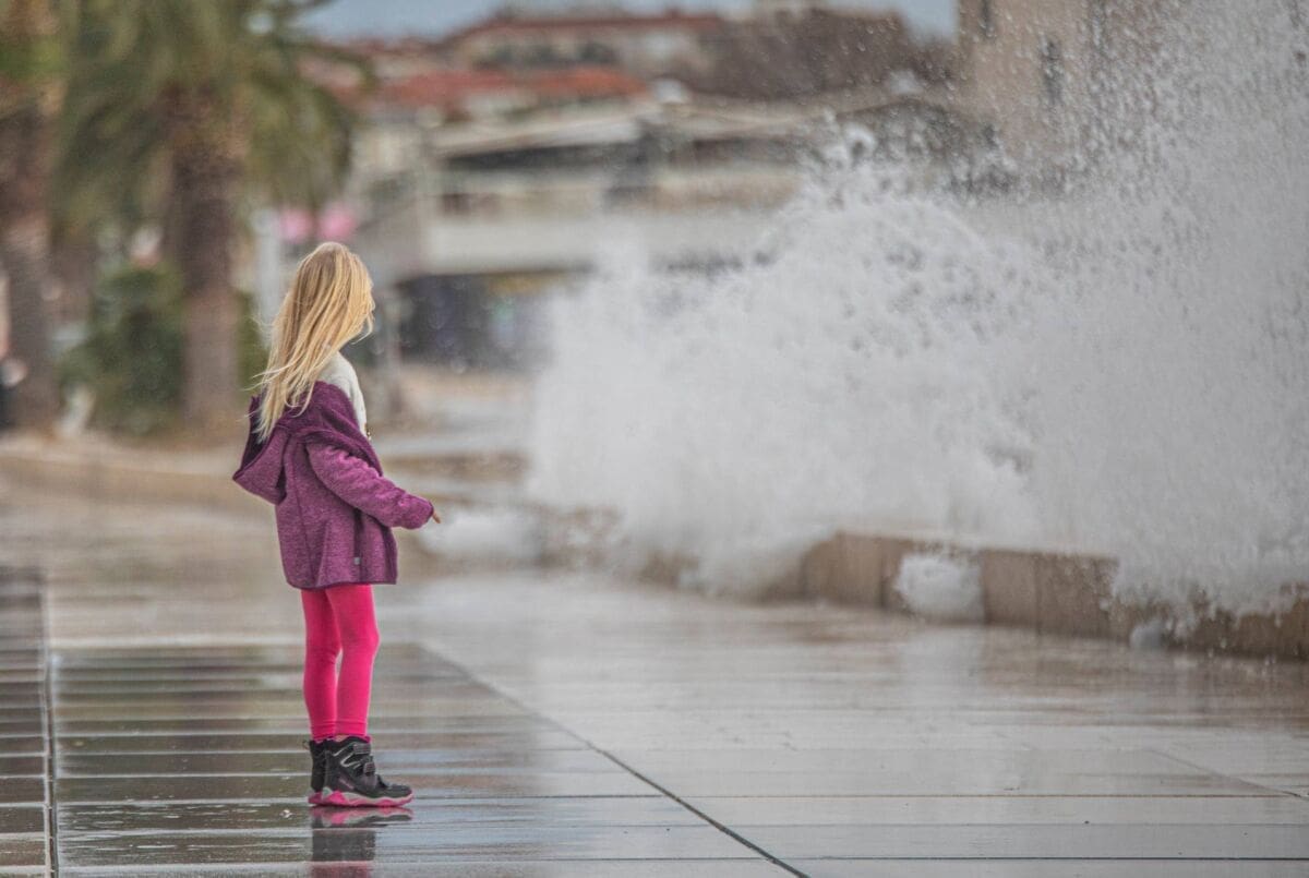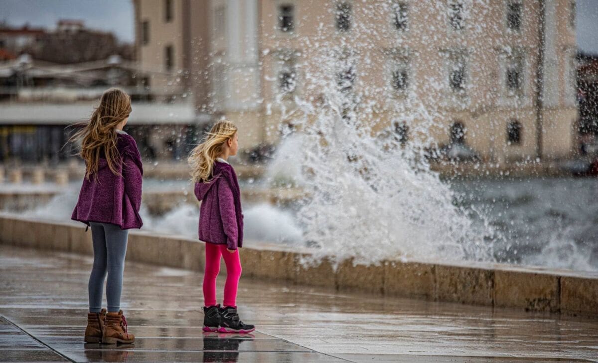 Udaralo je more o Rivu, dobro je natopilo, a sigurno je smočilo i pokojeg prolaznika. Djeca su s oduševljenjem izbjegavala udare mora o Rivu, no čini se da im nije smetalo da ih malkice i poškropi.
