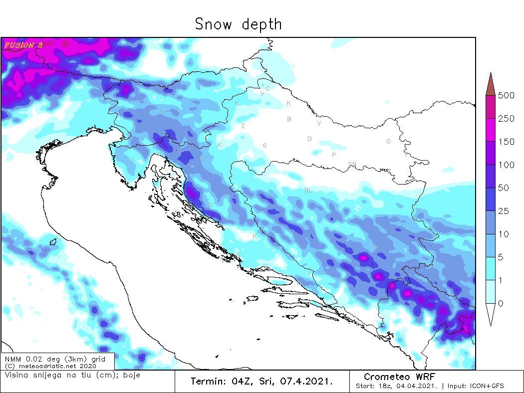 Iako se radi samo o prognozi, na sljedećoj karti možete vidjeti gdje prognostički model predviđa snježni pokrivač kao i njegovu veličinu (do kraja utorka):