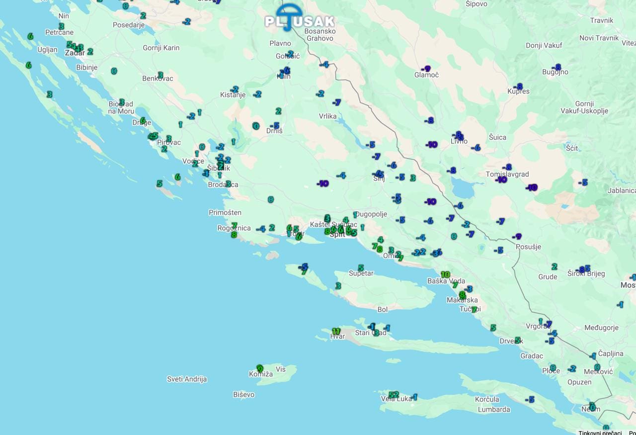 Jutro u Dalmaciji donijelo je pravu zimsku sliku: u dijelovima Zagore temperature su se spustile i do -10 °C, a mraz je bio raširen gotovo posvuda u unutrašnjosti, mjestimice čak i uz obalu i na otocima.