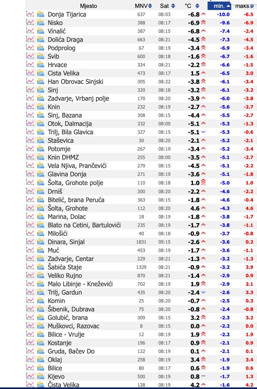 Najhladnije je izmjereno u Nisku i Donjoj Tijarici, gdje su minimalne jutarnje vrijednosti dosegnule spomenutih -10 °C. Vozačima i pješacima u višim i zavjetrinskim predjelima Zagore jutro je proteklo uz poledicu i zaleđene površine, dok je hladan zrak ponegdje "procurio" sve do priobalja.