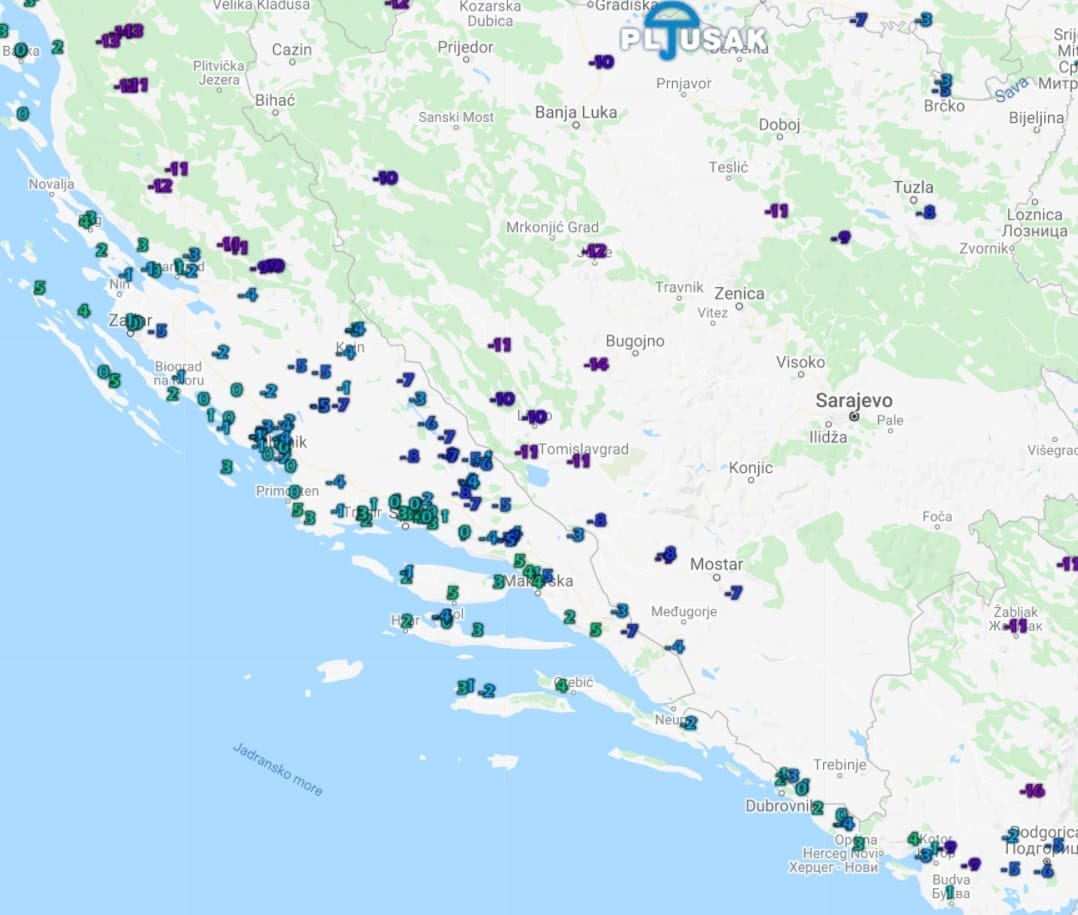 Ni Dalmaciju nije zaobišla hladnoća. U nekim kotlinama Dalmatinske zagore jutros je izmjereno -10°C. U Sinju je minimalna temperatura iznosila -8°C. Zanimljivo, u Starome Gradu na Hvaru izmjereno je -4°C, a slabog mraza je bilo na većini otoka. Uz obalu je većinom bilo od -1 do 4°C. Ovako niske temperature zraka vjerojatno se neće ponoviti niti do kraja mjeseca.