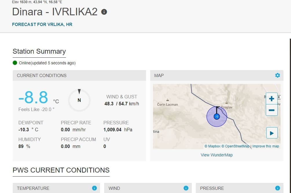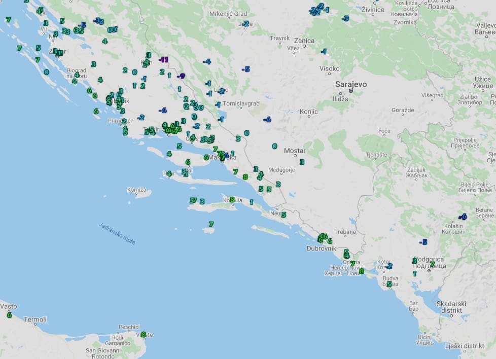 Uvjerljivo najhladnija postaja u Hrvatskoj je ona na vrhu Dinare, Sinjalu. Tamo je izmjereno -11°C. Na još jednom vrhu Dinare, Velikoj Duvjakuši izmjereno je -9°C, no uz jaku buru osjet hladnoće povremeno je padao do -20 stupnjeva.
