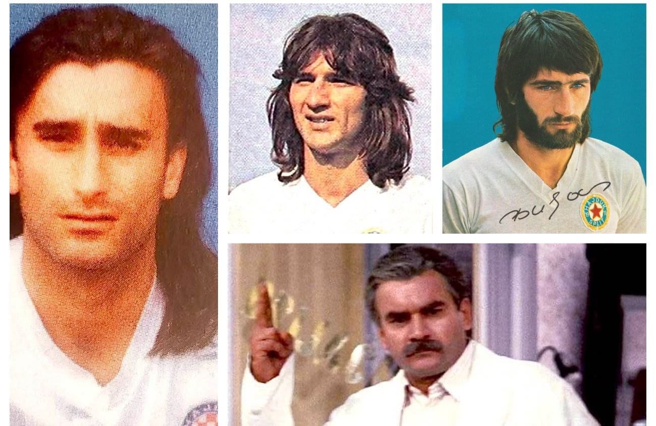 Pa tako u fotogaleriji imamo frizure hajdukovaca: dugokosog Ivicu Šurjaka, kao da još vijori kosom po lijevome krilu, brkove i dugu kosu Luke Peruzovića, Žungula, koji će je ubrzo prošetati po njujorškom klubu Studio 54, Boljata, Jarnija, Džonija, ljepuškastog Borišu Đorđevića, Buljana, Bokšića… u Rambo stilu Zorana Varvodića i Nikicu Cukrova. Tu su i meštri zlatnih ruku Boris Dvornik i njegov odani Papundek, nažalost također preminuli glumac Duško Valentić.