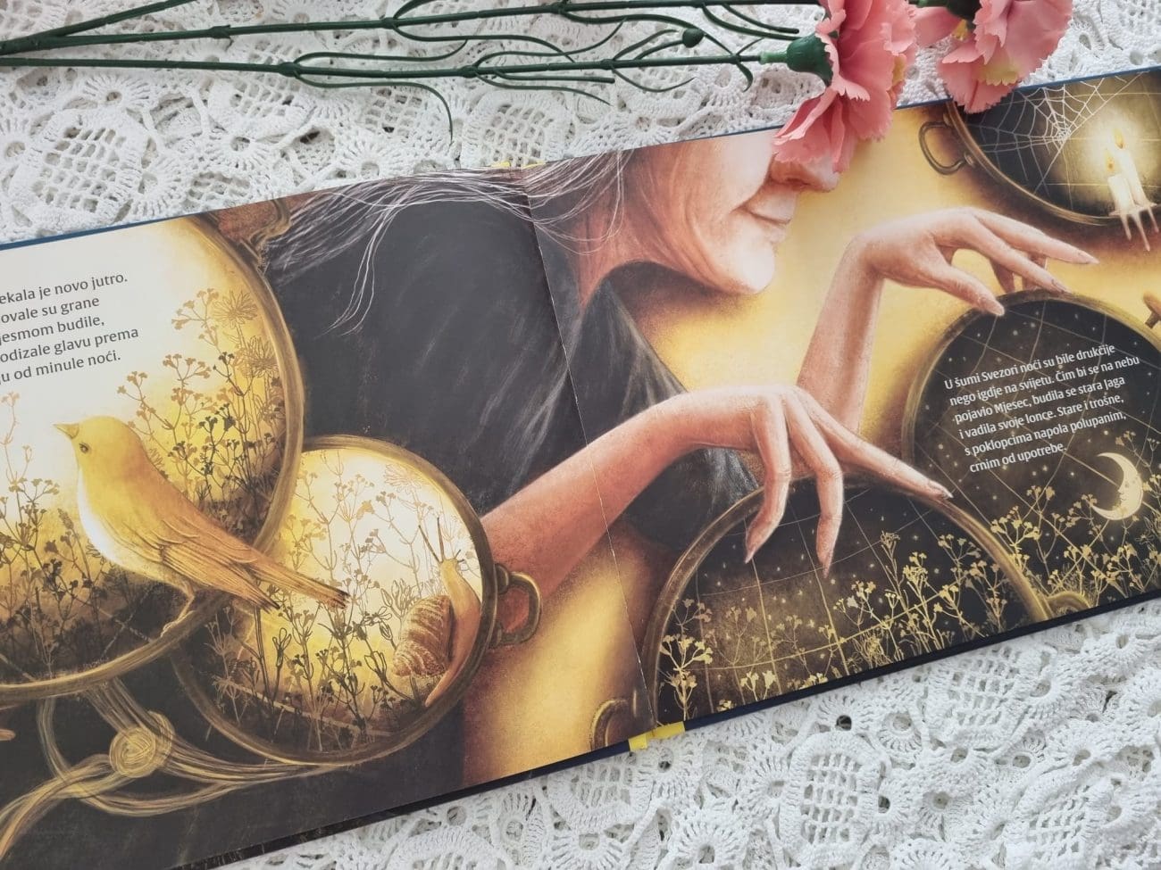 Vjerojatno se većina nas s likom Babe Jage susrela kroz bajke koje joj uopće nisu bile naklonjene. U jednoj od ruskih verzija, koja je potpisnicu ovih redaka zatekla u ranom djetinjstvu, Baba Jaga bila je jeziva vještica s koštanom nogom. Letjela je u čarobnom kotlu ili mužaru, najčešće da se s nekim obračuna. Maltretirala je svoju mačku, ulijevala strah u kosti svakome tko bi ugledao njezinu kuću na kokošjim nogama, sanjala o obroku od ljudskog mesa. Nataša Jukić svoju Jagu u slikovnici „Jagin lonac“ oslikava kao suštu suprotnost vještici iz slavenske mitologije. Njezine bore i sijeda kosa nisu posljedica starosti, odvratnosti ni gnjiljenja duše. Njezinu su Jagu naprosto stigle godine, godine pune mudrosti. Lonac, koji se posebno u ruskim verzijama veže za ideju Jagina prijevozna sredstva, ovdje je svojevrsno ogledalo duše. Nešto između blagoglagoljiva ogledala Snjeguljičine maćehe i zrcala Erised u romanima o Harryju Potteru, gdje odraz otkriva najdublje želje onoga tko u nj gleda.