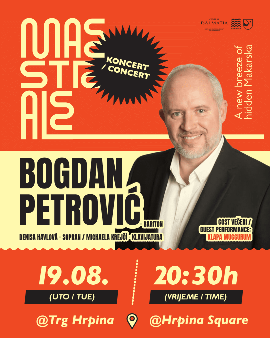Koncert: Bogdan Petrović (bariton), Denisa Havlová (sopran), Michaela Krejči (klavijature) i gost večeri Klapa Muccurum – večer klasičnih nota koje ostaju urezane u pamćenje.
