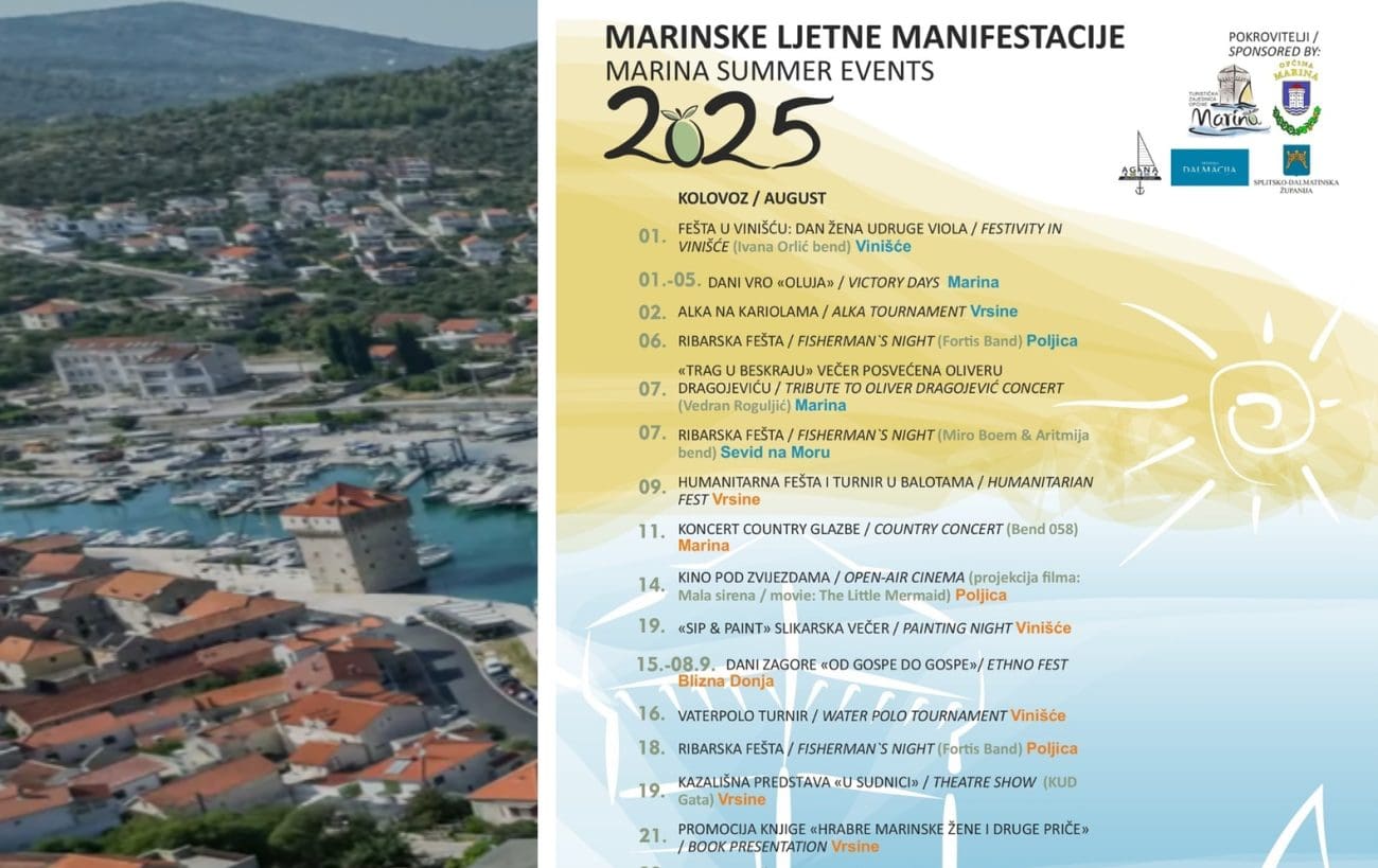 Turistička zajednica općine Marina objavila je program "Marinskih ljetnih manifestacija 2025.", bogat nizom kulturnih, glazbenih, sportskih i humanitarnih događanja koji će obilježiti kolovoz i početak rujna.