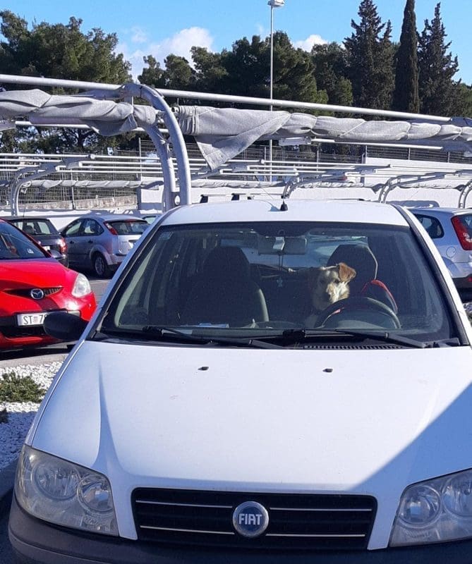 Na vozačevom mjestu u automobilu stoji pas. Je li on sretan ili ljutit teško je odrediti, ali je jedno sigurno da nestrpljivo čeka vlasnika/cu.