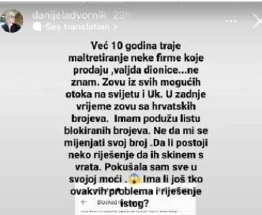 "Već deset godina traje maltretiranje neke firme koje prodaju, valjda dionice… Ne znam. Zovu iz svih mogućih otoka na svijetu i Ujedinjenog Kraljevstva. U zadnje vrijeme zovu s hrvatskih brojeva. Imam podužu listu blokiranih brojeva. Ne da mi se mijenjati svoj broj. Postoji li neko rješenje da ih skinem s vrata? Pokušala sam sve u svojoj moći", upitala je svoje pratitelje.