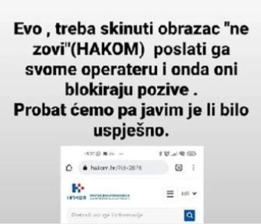 "Evo, treba skinuti obrazac 'Ne zovi' (HAKOM) i poslati ga svom operateru i onda oni blokiraju pozive. Probat ćemo pa javim je li bilo uspješno", istaknula je.