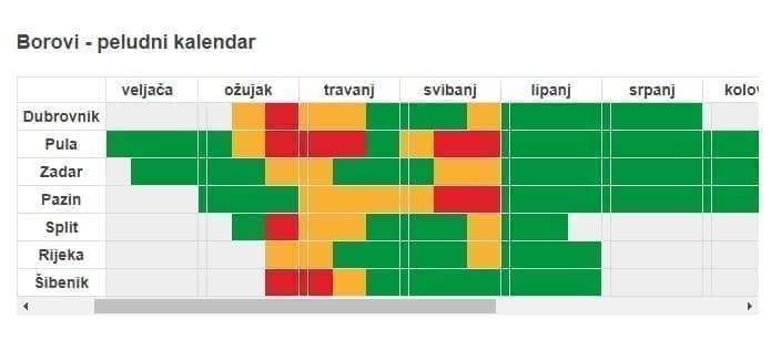 Zbog kiše koja danas pada, koncentracija peludi je u opadanju, no na područjima koja se nalaze uz borovu šumu, može se primijetiti da su lokve žute boje, upravo zbog saprane peludi.