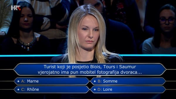 Džoker "zovi" odgovorio je kako je sve što zna ono da na Loireu ima puno dvoraca pa je natjecateljica zatim odlučila džokerom preploviti ponuđene odgovore. Nakon što su ostali Marne i Loire, Anin konačni odgovor bio je Loire kojim je osvojila iznos od 8.000 kuna.