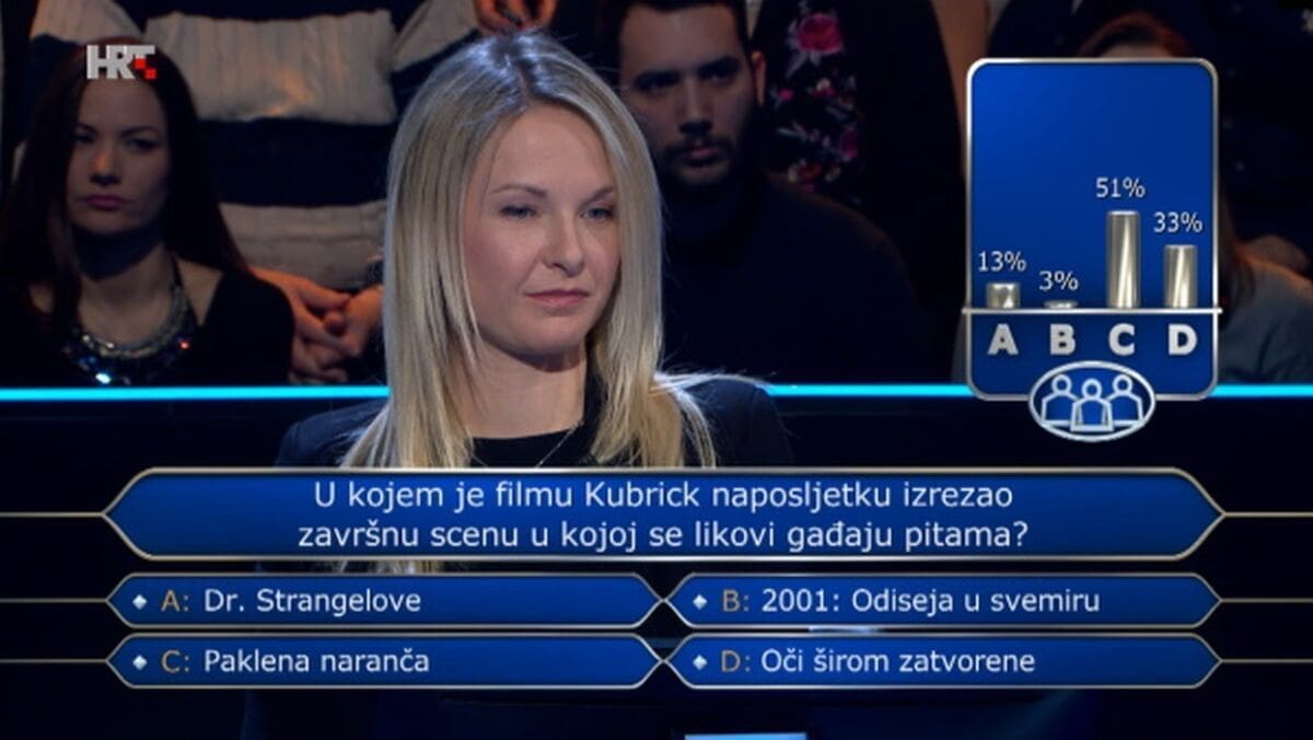 No već na idućem pitanju filmske tematike iskoristila je posljednju pomoć. Upitala je publiku u kojem je filmu Kubrick naposljetku izrezao završnu scenu u kojoj se likovi gađaju pitama. Je li riječ o ostvarenju Dr. Strangelove, 2001: Odiseja u svemiru, Paklena naranča ili Oči širom zatvorene?