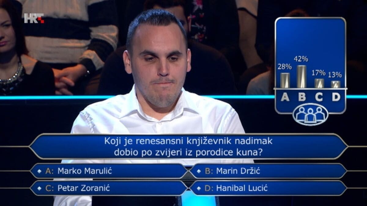 Srednjoškolski profesor rodom iz sela Hrvatsko Polje pokraj Otočca prema voditeljevoj preporuci zamolio je pomoć publike na 6. pitanju u kojemu se tražilo ime renesansnog književnika koji je nadimak dobio po zvijeri iz porodice kuna.