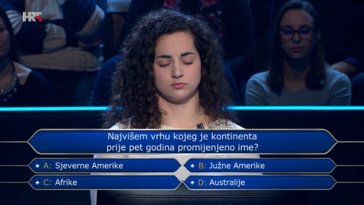 Najvišem vrhu kojeg je kontinenta prije pet godina promijenjeno ime? Tako je glasilo pitanje, a bili su ponuđeni odgovori - Sjeverna Amerika, Južna Amerika, Afrika i Australija. Bez previše razmišljanja, prepolovivši ih posljednjim raspoloživim džokerom, između Sjeverne i Južne Amerike odlučila se za Sjevernu Ameriku i pritom dala točan odgovor.
