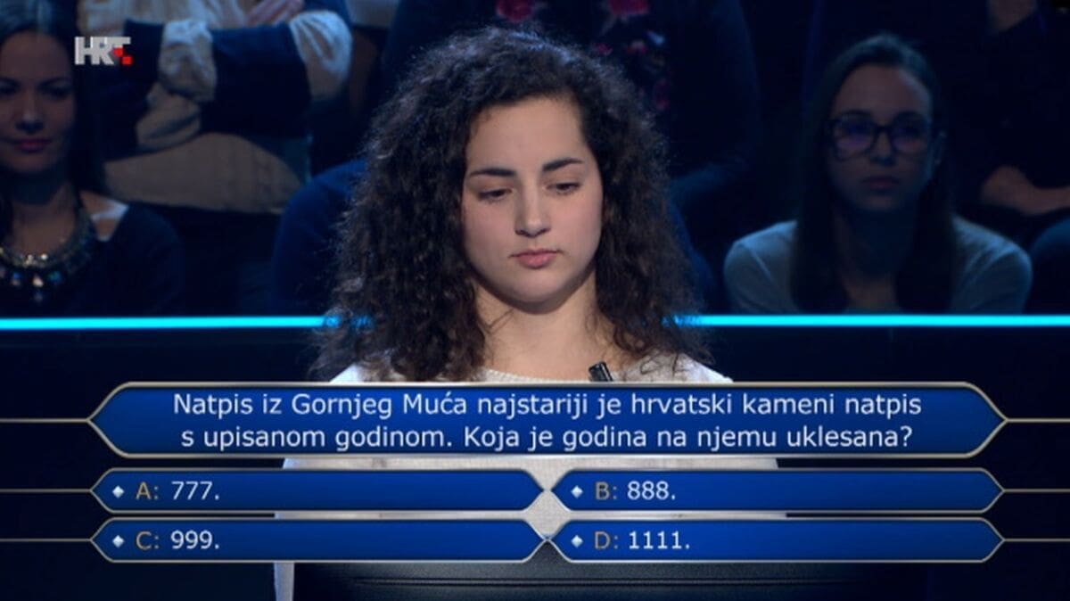 A njezin konačni "odustajem" bio je onaj na pitanju za prelazak drugoga praga. Nije znala koja je godina uklesana na natpis iz Gornjeg Muća, najstariji hrvatski kameni natpis s upisanom godinom.