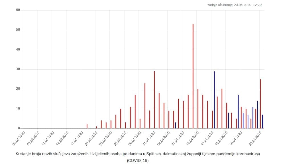 Na području Splitsko dalmatinske županije do sada su zabilježena 459 slučaja zaraze koronavirusom, od toga su 104 osobe izliječene te je na dan 23.04.2020. na području Splitsko dalmatinske županije pozitivno na COVID infekciju 355 osoba.