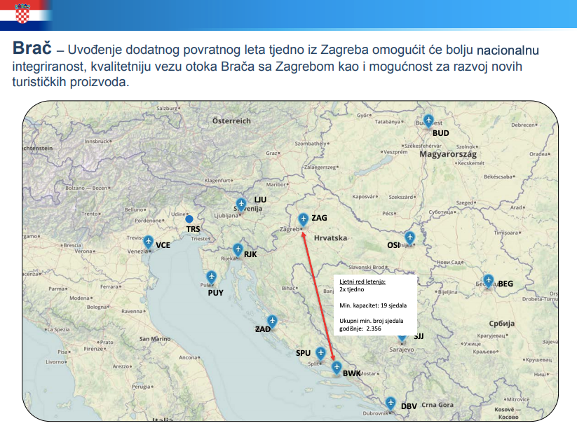 Sezonska linija Zagreb - Brač - Zagreb po PSO programu trebala bi prometovati dva puta tjedno, no kompanija je otkazala letove utorkom do svibnja, a otkazani su i planirani letovi subotom do 24. travnja čime očito neće biti zadovoljen minimalno propisani broj dostupnih sjedala na liniji u ovoj godini.