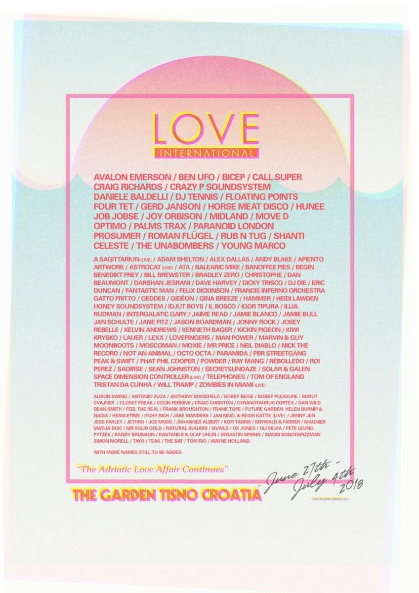 Love International se po treći put vraća u Hrvatsku, a u The Garden Resortu u Tisnom na rasporedu je od 27. lipnja do 4. srpnja 2018! Najnoviji line-up otkriva filozofiju festivala koji kreira svoj program dovodeći neke od najboljih svjetskih DJ-eva, producenata, izdavačkih kuća, kolektiva, a ne najvećih imena.