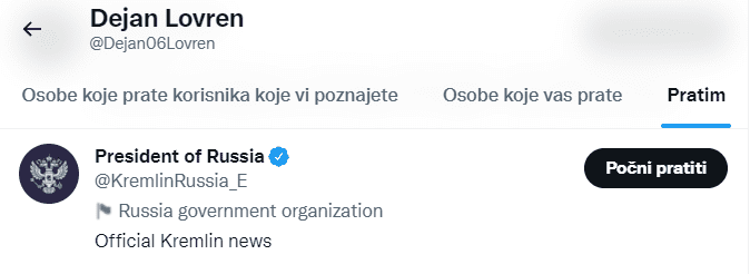Lovren zato na Twitteru prati Vladimira Putina, ruskog predsjednika kojeg političari, ali i nacije diljem svijeta prozivaju zbog invazije koju je započeo na Ukrajinu, mogućih ratnih zločina nad ukrajinskim stanovništvom te posljedica do kojih je došlo zbog rata na europskom tlu.