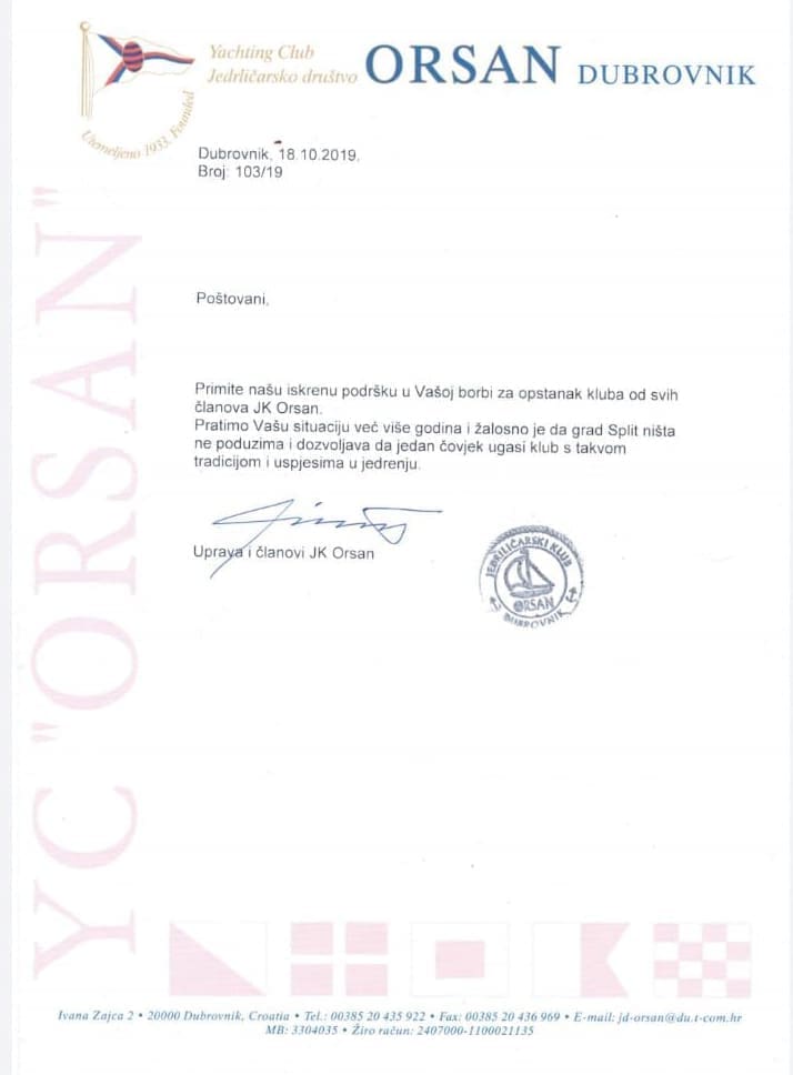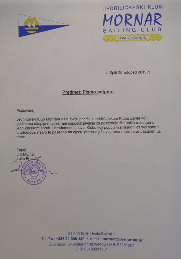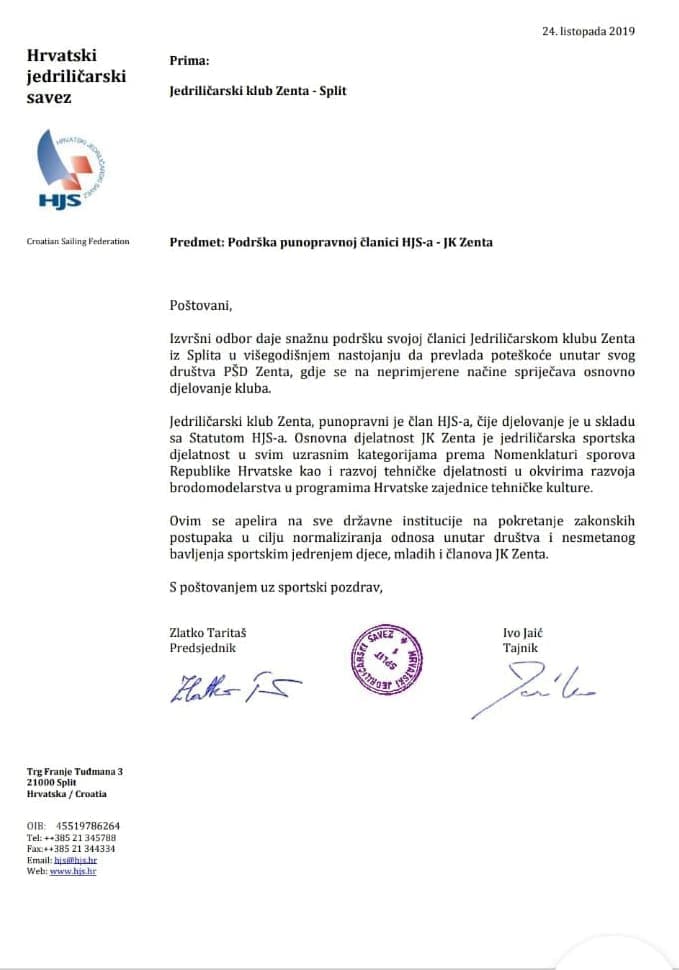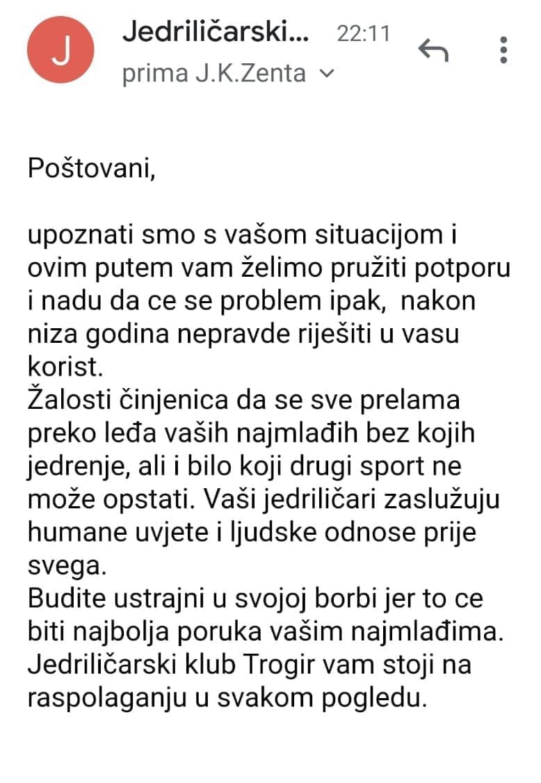 Predsjednik JK Zenta Damir Dominović na njegove riječi reagirao je pismima podrške Hrvatskog jedriličarskog saveza, Zajednice tehničke kulture grada Splita, Splitskog saveza športova i brojnih jedriličarskih klubova, od Dubrovnika do Trogira. Rezultate mladih jedriličara i brodomodelara koji su prolazili škole JK Zenta, kaže, neće ni nabrajati, jer toliko su trofejni da bi to oduzelo previše prostora i vremena. Punu podršku Jedriličarski klub Zenta, koji broji oko 200 članova, dobio je i od 580 članova Kluba športskih ribolovaca Zenta što nam je potvrdio njihov predsjednik Slobodan Erceg.