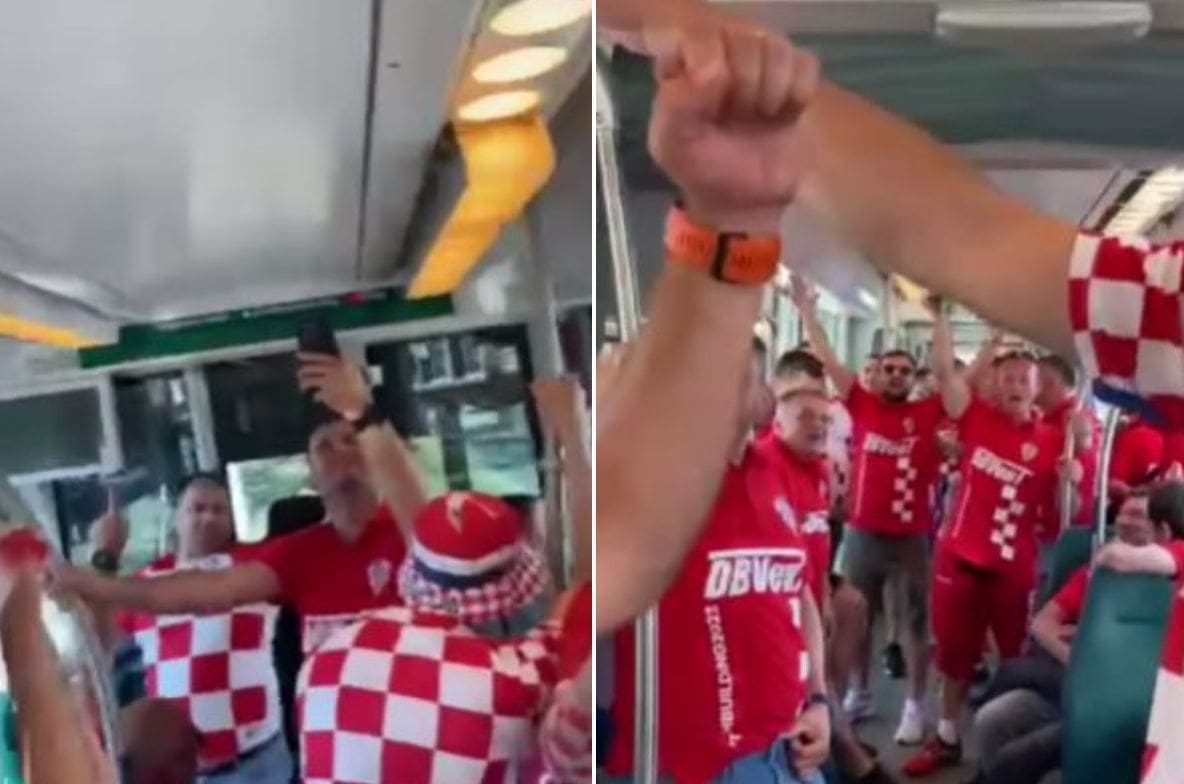 Navijači u hrvatskim dresovima za vrijeme vožnje tramvajem pjevaju hit Dina Merlina 'Bosnom behar probeharao'.