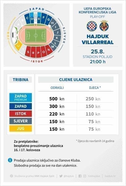 U utorak 16. kolovoza s početkom u 12 sati počinje preuzimanje i prodaja ulaznica za sve pretplatnike i članove za uzvratnu utakmicu Play-offa Konferencijske lige Hajduk - Villarreal koja će se igrati 25. kolovoza na stadionu Poljud s početkom u 21 sat.