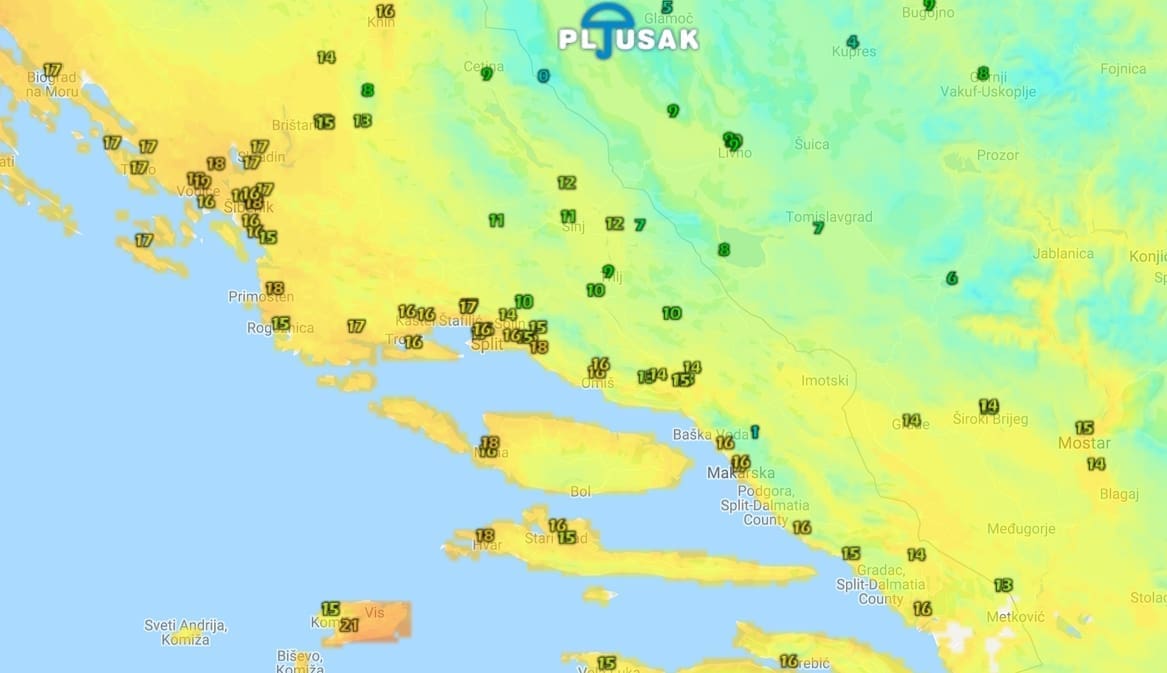 Najviše oborina do 18 sati bilo na Biokovu, gdje je palo 6 litara po kvadratnom metru. Povremenih pljuskova bilo je i u Podbiokovlju.