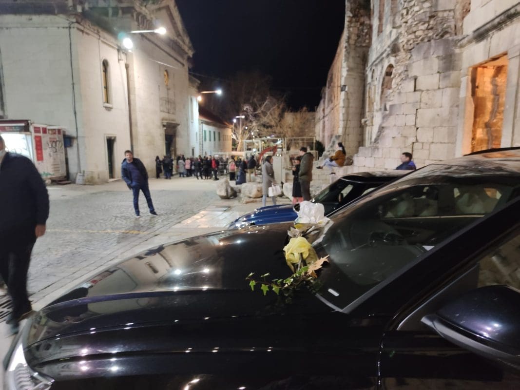 Nakon što su sinoć slavili u Žrnovnici u restoranu Grašinog prijatelja, mladenci su poslijepodne odradili službeno fotografiranje za svoj vjenčani album, a u ovim trenucima okupljaju se pred crkvom Sv. Dominika u Splitu.