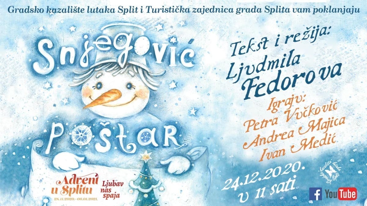 Predstava Snjegović Poštar jedna je od najtraženijih u adventskome programu Gradskog kazališta lutaka (GKL) u Splitu koje je, u suradnji s Turističkom zajednicom grada Splita, odlučilo za Badnjak obradovati sve male Splićane, Splićanke i zaljubljenike u lutkarske predstave diljem Hrvatske. Zbog izrazito velike potražnje i mogućnosti da samo dvadesetak roditelja i djece bude prisutno na izvedbama, svi će moći putem interneta uživati u ovoj blagdanskoj priči ruske redateljice Ljudmile Fedorove. Prijenos uživo počinje u četvrtak, 24. prosinca u 11:00 sati, stoga već sada putem linka https://youtu.be/_hbFheoryO4 postavite podsjetnik na predstavu kako biste jutro proveli u ugodnome društvu Snjegovića Poštara i svojih najmlađih.