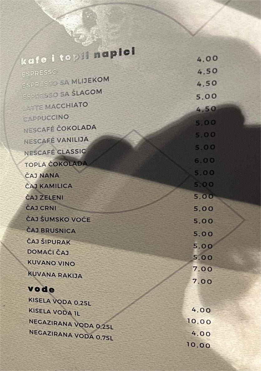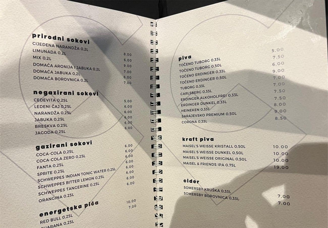 Ćevapi su 19 maraka (9,5 eura), kao i pileći file, a gurmanska pljeskavica 21 marka (10,5 eura). Biftek na žaru 45 maraka (23 eura). Teleće pečenje s domaćim krumpirom 34 marke (17 eura), grah s kobasicom 18 maraka (9 eura), dok je juneći gulaš 22 marke (11 eura). Raspon cijena salata je od 7 do 10 maraka, ovisno o vrsti. Najskuplja je šopska, 10 maraka (5 eura).