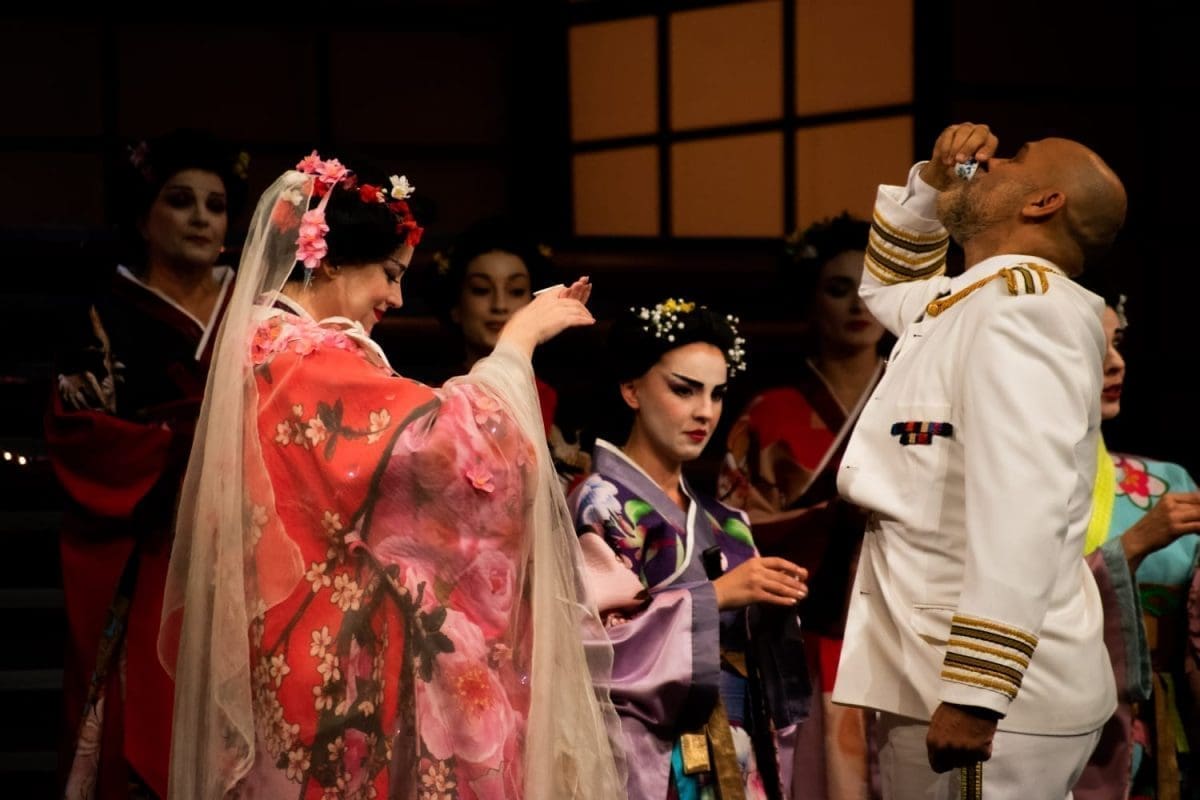 Premisa se libreta temelji na nejednaku položaju muškarca i žene, a samim time i kritično drugačijem poimanju ljubavi i braka. Petnaestogodišnja Cio-Cio San (Daniela Schillaci) udaje se za poručnika američke mornarice Pinkertona (Max Jota) koji nonšalantno objašnjava vidno uznemirenom američkom konzulu Sharplessu (Davor Radić) da se i brak i kuća mogu otkazati svakog prvog u mjesecu te da će kad-tad oženiti Amerikanku. Ženidbeni posrednik Goro (Vinko Maroević) otkriva da je mlada Cio-Cio San, iako osiromašena, plemenita podrijetla, te da je njezin otac, pavši u dvorsku nemilost, izvršio samoubojstvo harakirijem. Matičar (Mate Akrap) predvodi brzinski obred koji daje naslutiti ishitrenost dogovora između iskreno zaljubljene Butterfly i proračunata Pinkertona, na početku vođena ljepotom i šarmom mlade supruge. Japanski svećenik Bonze (Božo Župić), ujak Cio-Cio San i Yakuside (Vlatko Belas) oštro kritiziraju njezin brak i promjenu vjere, pri čemu ujaku osuđivačkim šaptom i prokazivanjem pomažu dotad oduševljene rođakinje i prijateljice Cio-Cio San u interpretaciji ženskog dijela Zbora HNK-a.