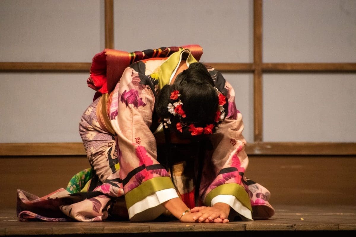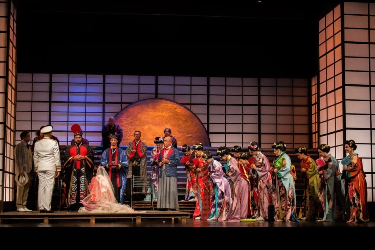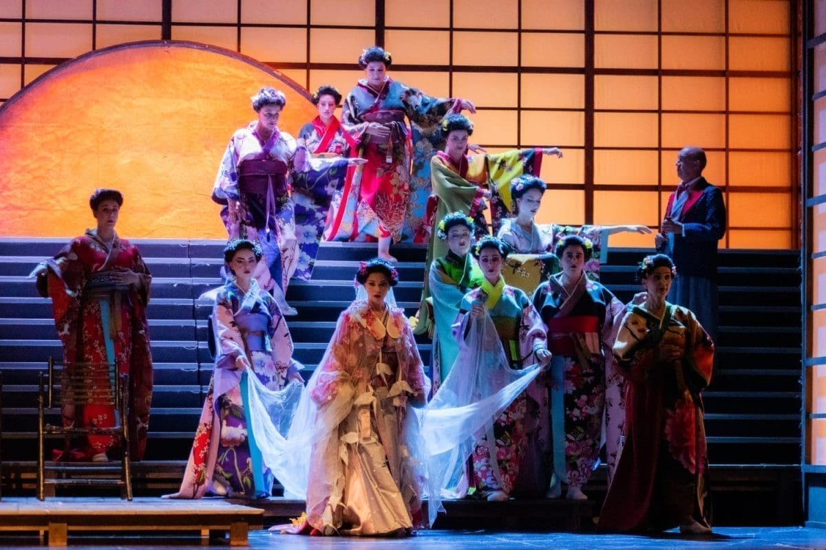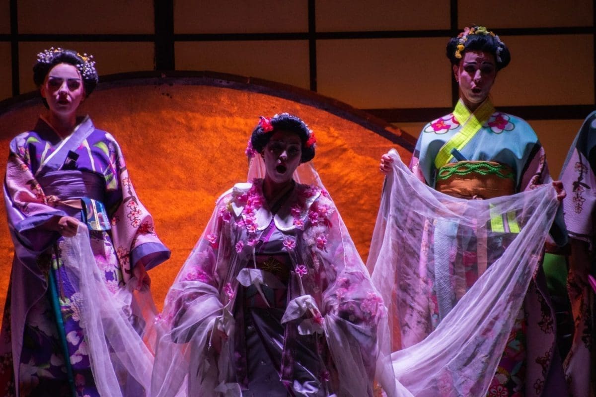 Uz odličnu podršku orkestra, koji valja posebno pohvaliti u brzom tempu i sugestivnim intermezzima dionica pretopljenih noćnom atmosferom i melankoličnošću, velik je utjecaj na lijep, snažan dojam o djelu imala sjajna kostimografija i scenografija. Sunce i Mjesec pretapali su se u izvrsnoj igri svjetlom i bojama, japanska trešnja, cvijeće, lampe i lepeze nedvosmisleno su evocirali orijentalnu atmosferu, kao i prekrasni, slojeviti kostimi s mnogo pažnje u detaljima, bojama, printu i ukrasima (ždralovima, cvijeću, detaljima na mornaričkim odorama).